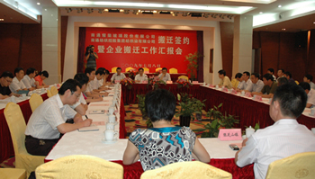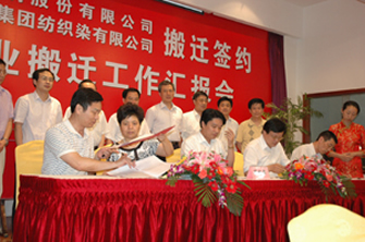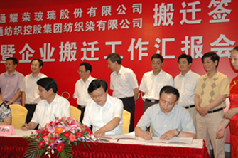 7月8日,在市經(jīng)貿(mào)委主持下,我公司與耀榮玻璃、紡織染簽訂《企業(yè)搬遷合同》。市政府徐輝副市長、宗劍峰及崇川區(qū)、通州區(qū)、政府相關(guān)部門及我公司有關(guān)領(lǐng)導(dǎo)出席簽約儀式。