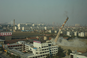 ----為全市實現(xiàn)“十一五”節(jié)能減排目標作出貢獻 11月8日下午3點整,隨著一聲悶響,位于南通熱電公司內一根有30年歷史的煙囪,順著設定的東南方向緩緩倒下,這標志著西城區(qū)集中供熱項目最后掃尾工作順利完成。 被爆破的煙囪高約80米,建于1980年,是由南通人自己建造的第一座高層煙囪,也是主城區(qū)最高的煙囪。去年,市委、市政府決定關停南通熱電和江山熱電,統(tǒng)一由大型供電企業(yè)集中供熱、供電。兩家熱電廠的關停,年可節(jié)約標準煤10萬噸、減排SO2約2800噸,為市區(qū)實現(xiàn)“十一五”節(jié)能減排目標作出重大貢獻。