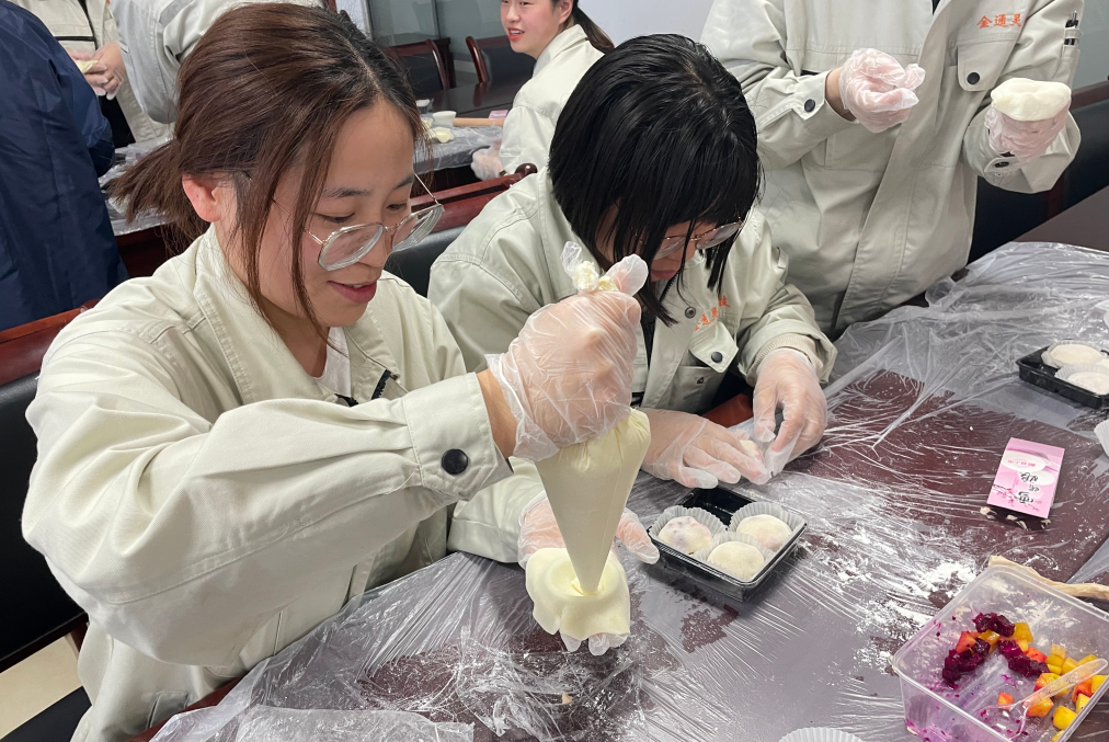 當(dāng)天下午,金通靈近100名女職工歡聚813活動室,在張老師的現(xiàn)場制作教導(dǎo)下,分別制作了雪媚娘和便當(dāng)?shù)案??;顒蝇F(xiàn)場,張老師講解了烘焙知識和制作流程,職工們在認(rèn)真聆聽后,體驗(yàn)著自己動手制作甜品的樂趣,享受著快樂的烘焙時光。隨著時間的推移,一個又一個飽滿、垂涎欲滴的雪媚娘、一個個精致的便當(dāng)?shù)案庵谱魍瓿伞?