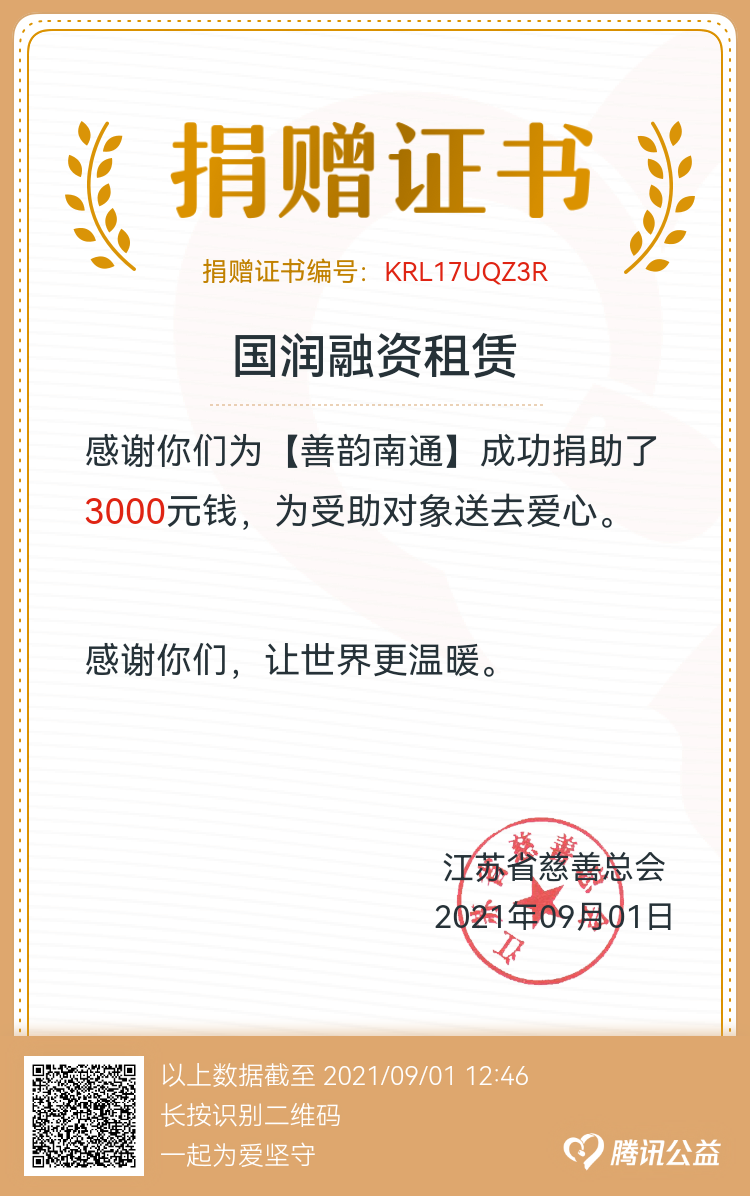 為大力弘揚(yáng)中華民族扶貧濟(jì)困的優(yōu)良傳統(tǒng),發(fā)揮慈善在脫貧攻堅(jiān)中的積極作用,按照市民政局等單位《2021年“博愛(ài)在南通 慈善暖江?!币蝗站杌顒?dòng)方案》的通知要求,國(guó)潤(rùn)租賃組織全體員工于9月1日開(kāi)展了線上一日捐活動(dòng)。