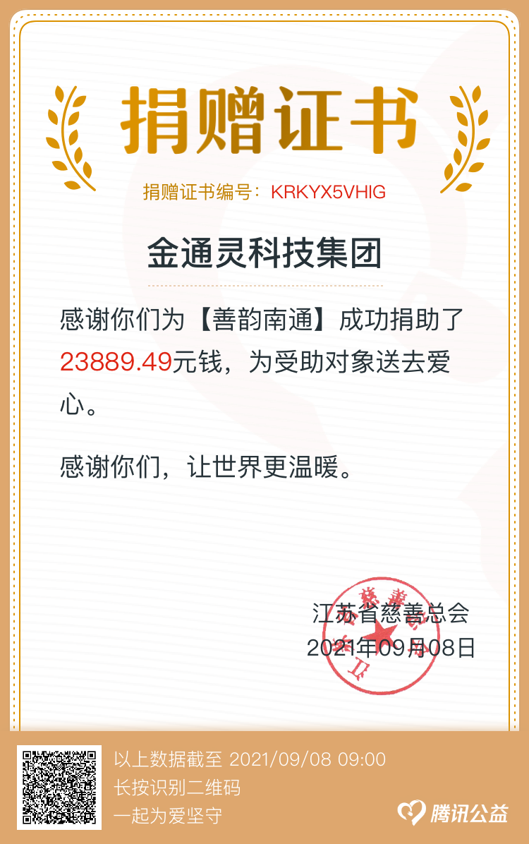 近日,我市組織開展“博愛在南通 慈善暖江?!?span>慈善一日捐活動,金通靈積極響應產(chǎn)控集團的號召,第一時間組織開展一日捐活動。截止到9月8日,金通靈共籌得善款23889.49元,募集資金將統(tǒng)一交至南通市慈善總會,繼續(xù)用于扶貧、慈善救助項目。