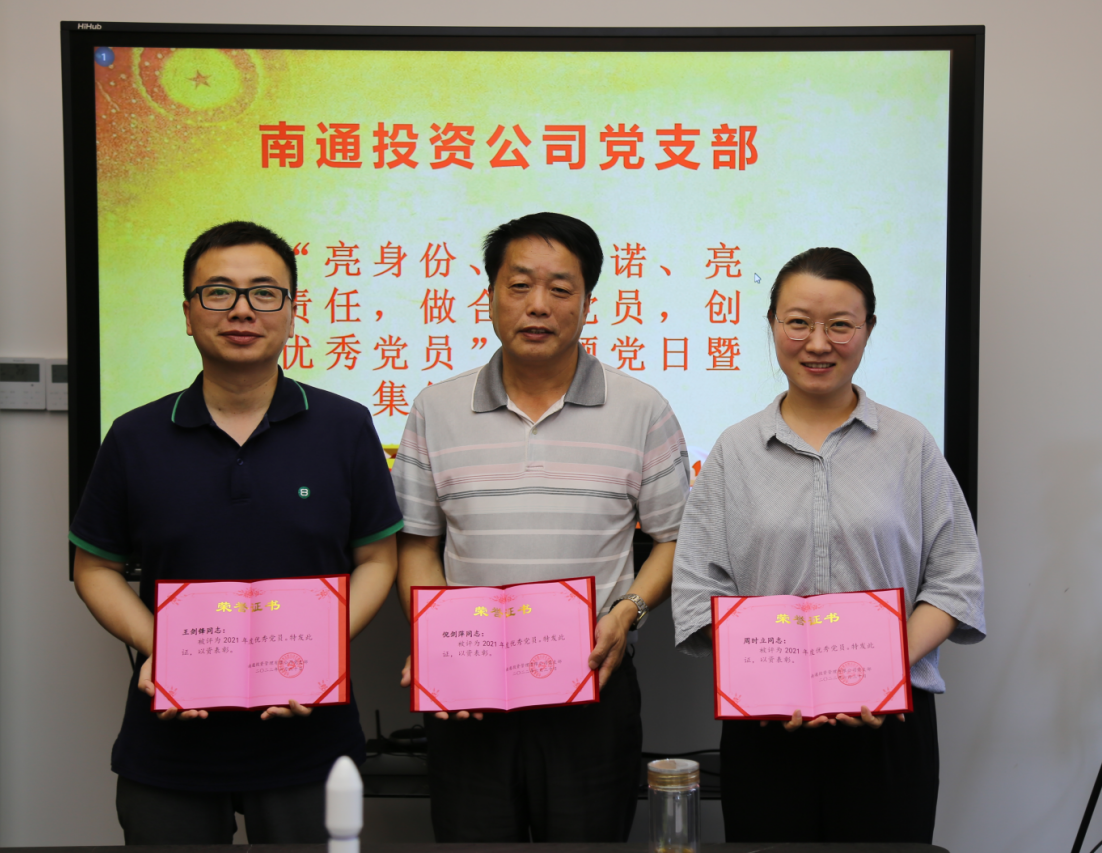 2022年7月1日是中國共產黨誕生101周年生日,下午南通投管全體黨員召開支部黨員大會,開展“亮身份、亮承諾、亮責任,做合格黨員,創(chuàng)優(yōu)秀黨員”主題黨日暨集體政治生日,支部為每位黨員精心準備了一份政治生日賀卡,賀卡上寫明本次活動主題,并分別為每個黨員填寫了黨齡;會上支部表彰了3名2021年度優(yōu)秀黨員;履行接受中共預備黨員的發(fā)展與表決程序,一致同意吸收2名同志成為中共預備黨員,黨員們結合黨員責任區(qū)及辦實事等內容,在五彩剪紙上撰寫服務承諾用語,貼在公司員工寄語墻上。