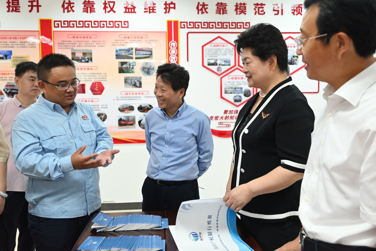 公司董事長(zhǎng)、總經(jīng)理袁擁軍代表公司全體員工對(duì)蔡毅德一行表示熱烈的歡迎,并陪同參觀了公司黨群活動(dòng)室、產(chǎn)改工作室,詳細(xì)介紹了在公司“五彩黨建”引領(lǐng)下,以“五個(gè)依靠、五心工程”為抓手開展的一系列產(chǎn)改工作。袁擁軍匯報(bào)了公司近年來在黨建工作、生產(chǎn)經(jīng)營(yíng)、科技創(chuàng)新、人才培養(yǎng)、產(chǎn)業(yè)工人改革等方面取得的優(yōu)異成績(jī)。調(diào)研過程中,來訪人員饒有興趣的了解了公司 “員工幸福計(jì)劃”、“知識(shí)產(chǎn)權(quán)銀行”制度、“青藍(lán)工程”等亮點(diǎn)工作和做法,并給予高度肯定。袁擁軍向來訪人員贈(zèng)送了由公司黨員和管理骨干開展讀書征文活動(dòng)編撰的 “單位如家、感恩有我”、“奮斗如歌”、“責(zé)任如磐、攻堅(jiān)有我”系列叢書。